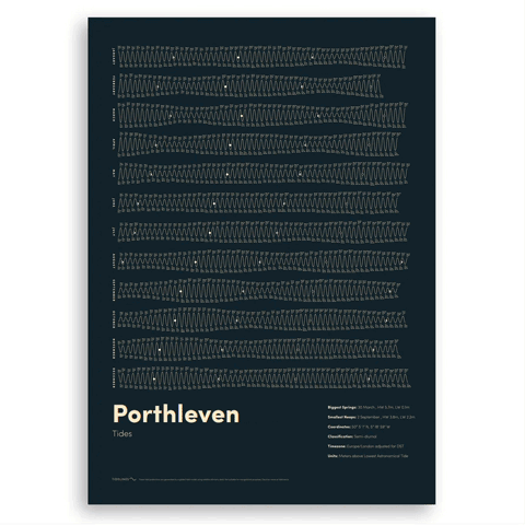 Unique annual tidal charts printed on demand, displaying times of high and low water, tide height, and lunar phases throughout the year.