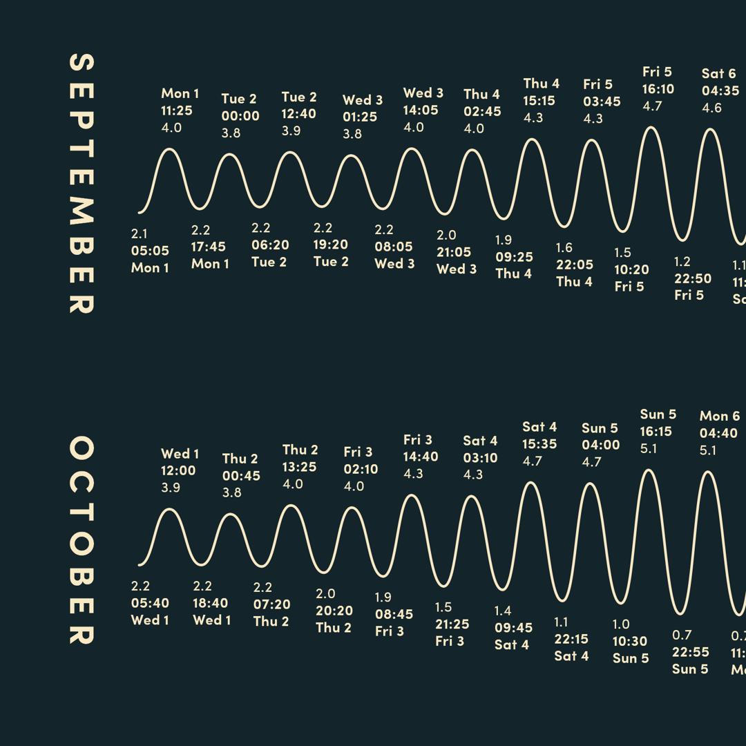 Select your favourite beach or harbour and create a unique tide chart that displays annual tide times for that exact location.