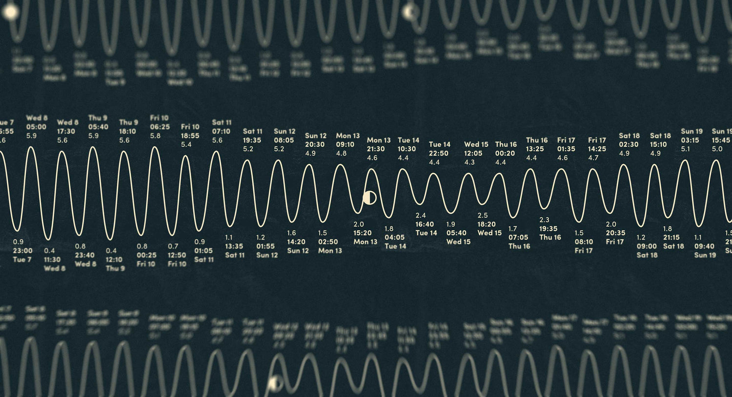 Monthly tidal curves that illustrate high and low tides, alongside lunar phases and their connection to spring and neap tidal cycles.